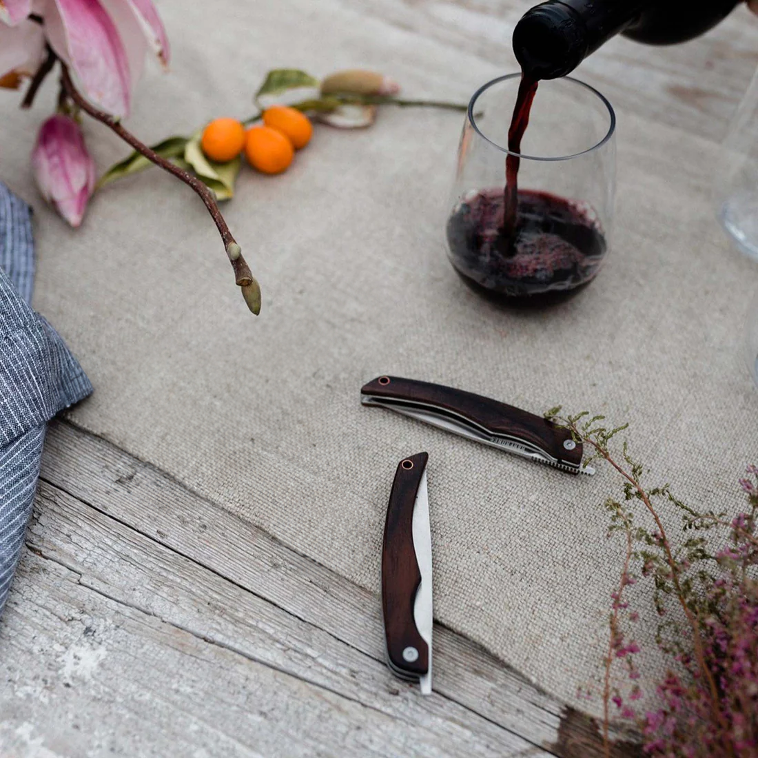 The Folding Steak Knife Set lets you enjoy your favourite foods from the patio to the picnic blanket. Its folding and locking stainless steel blade provide a safely packable cutting edge, and the hardwood handle and elegant design make it handsome enough for any setting.