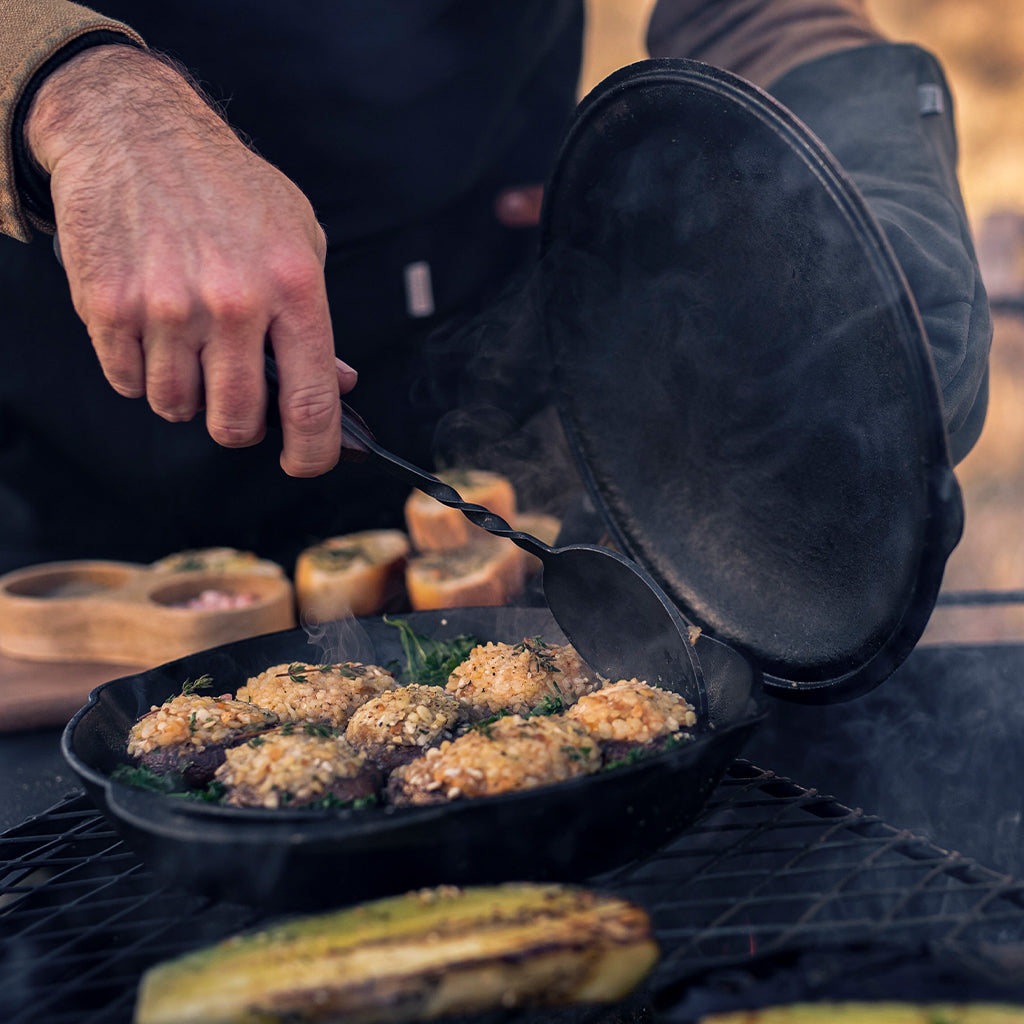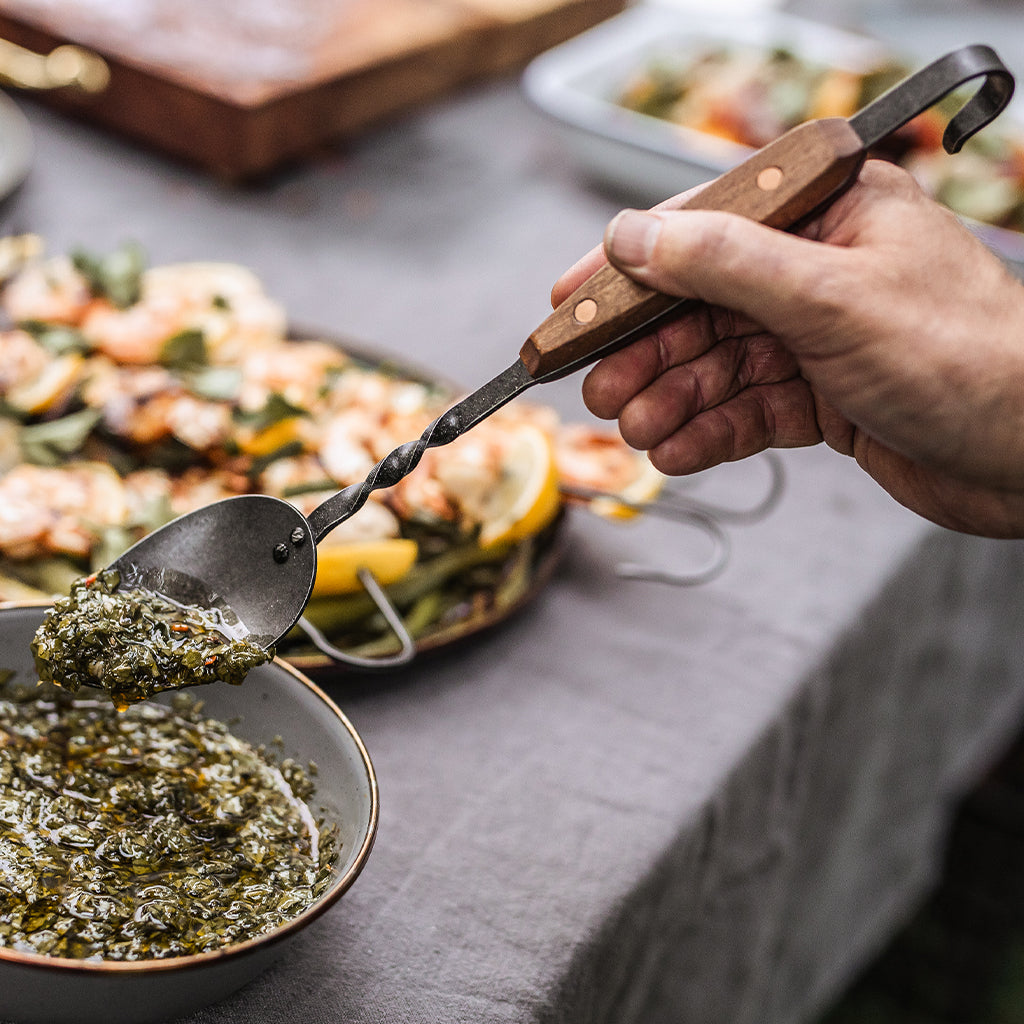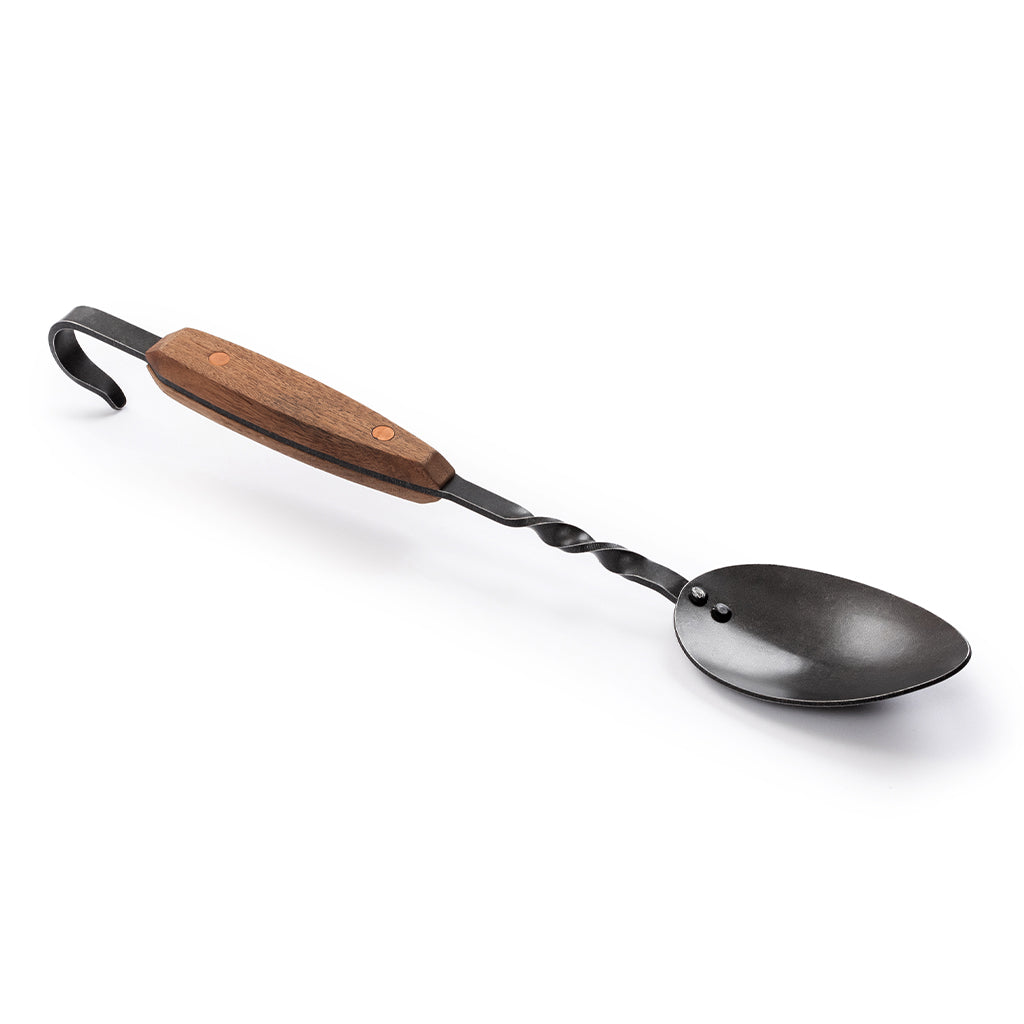 Designed to hang, our tools are crafted with hand-forged stainless steel and fitted with a smooth, natural walnut handle that keeps cool over high heat.