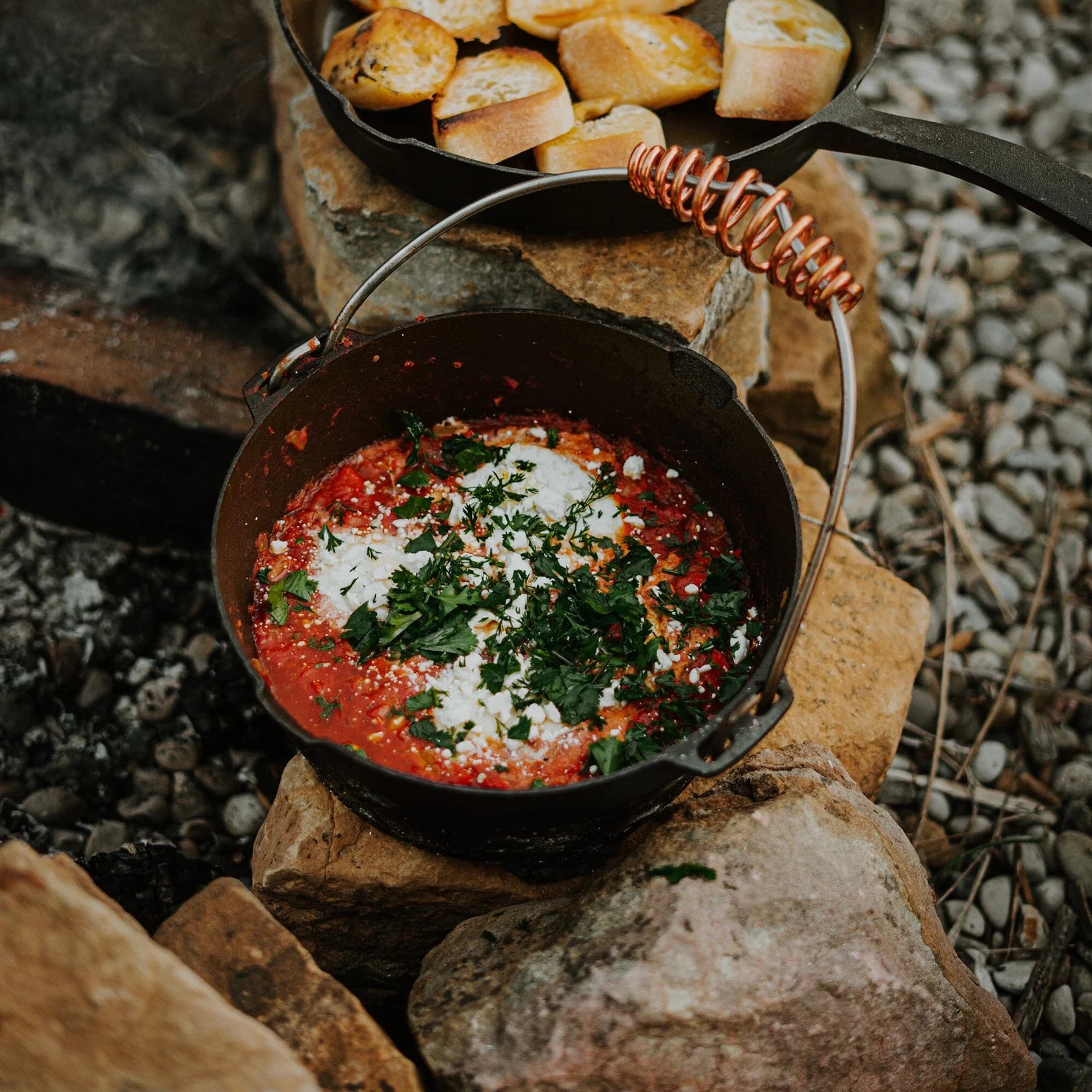 Meet the Polished Cast Iron Dutch Oven. Inspired by Japanese cookware and thoughtfully designed for open fire use, this Dutch oven is the deluxe cast iron pot you've been searching for. Included lid, circular polished interior, better heat distribution, extended handle, and copper accents make this a dream to cook with - from camp to kitchen. Pre-seasoned with organic sunflower oil and ready to use right out of the box.