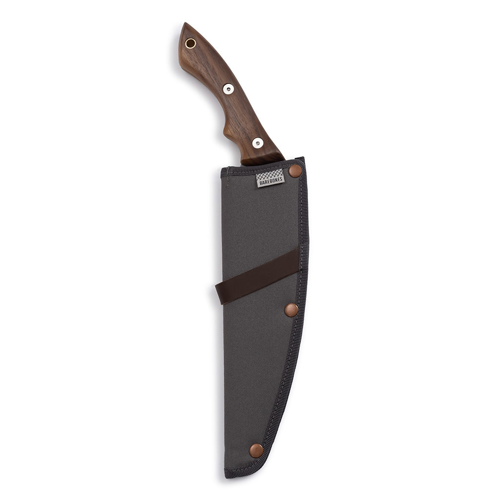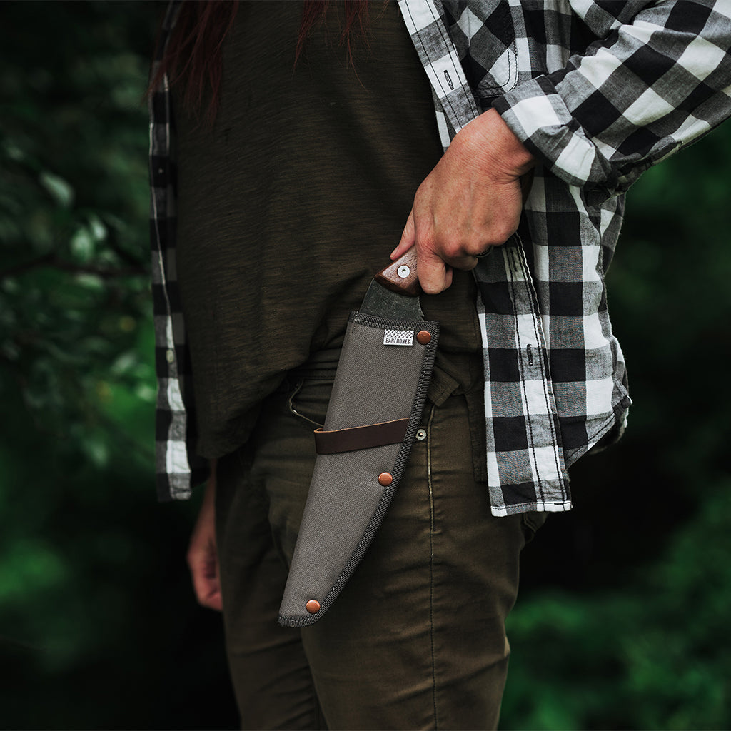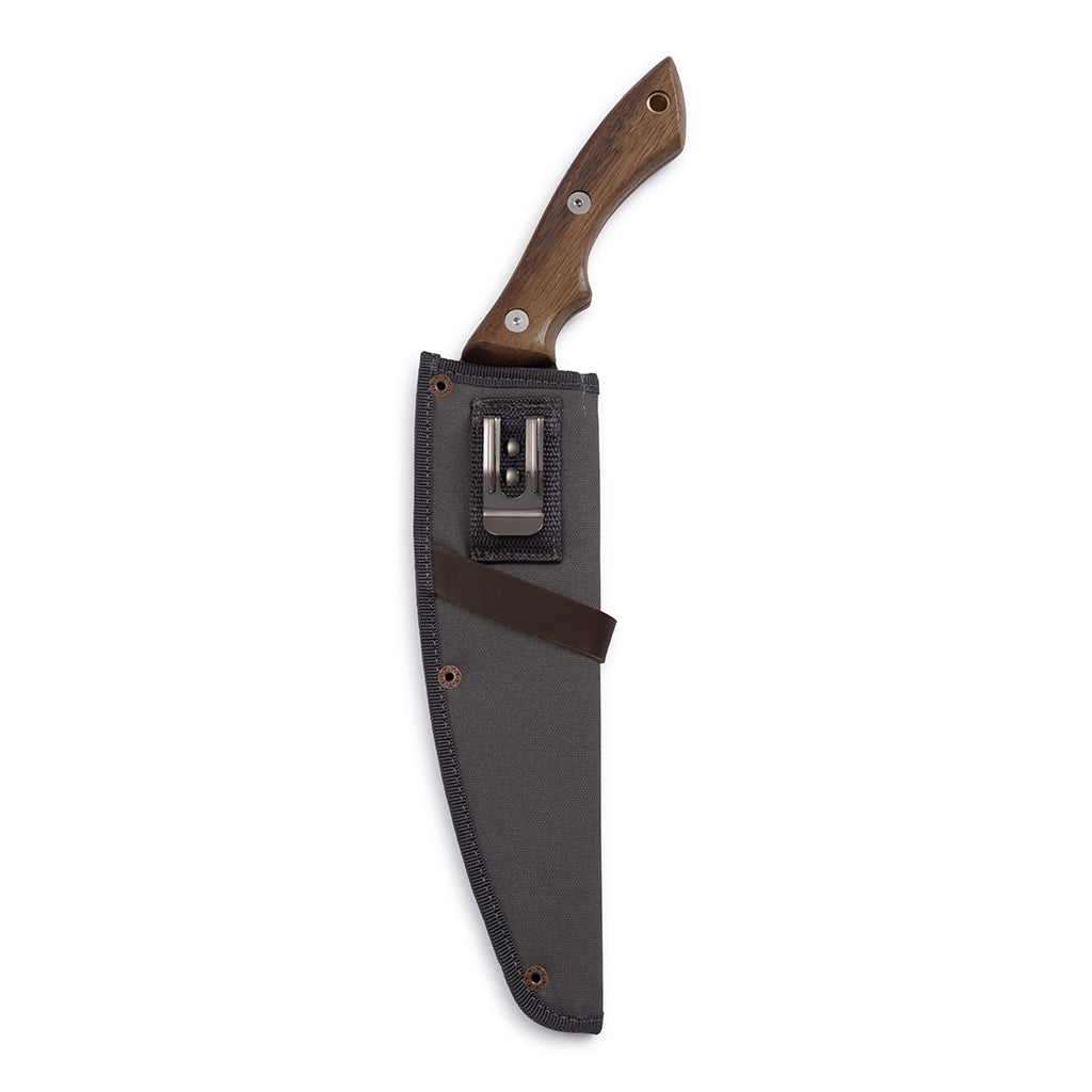 Included 900D polyester sheath weathers real-world use while protecting the blade from dulling. Stainless steel belt clip supports easy carrying and accessibility, while the strong handle strap restricts the blade from slipping or moving. Accented with full-grain leather and copper to complement the rest of the Woodsman Collection.