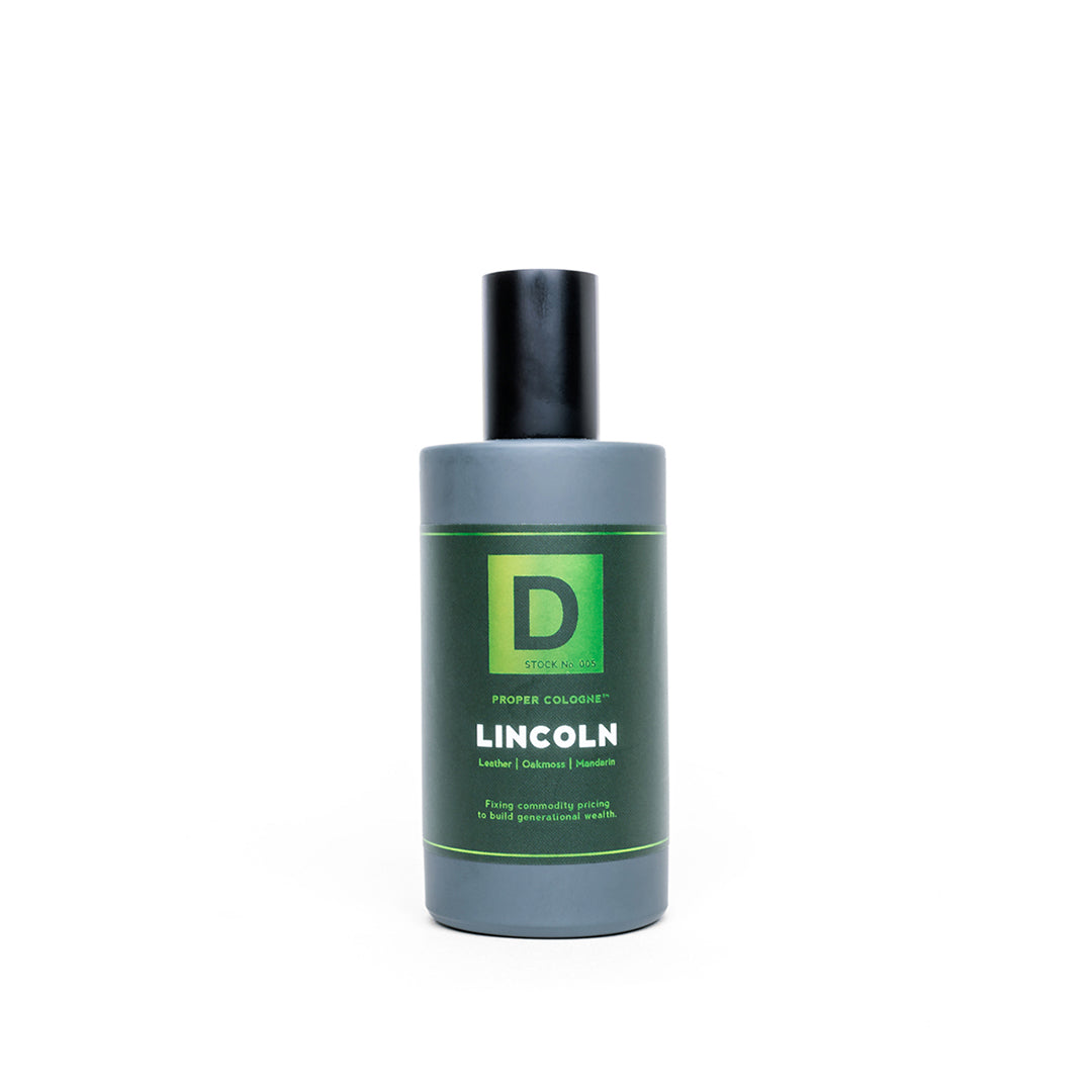 Lincoln is a fresh, yet nostalgic, scent that blends notes of leather and oakmoss with a hint of mandarin. Smells like sitting in a well-worn, tufted leather chair at the local barber shop, not a ripped fabric couch in the basement of a student flat.