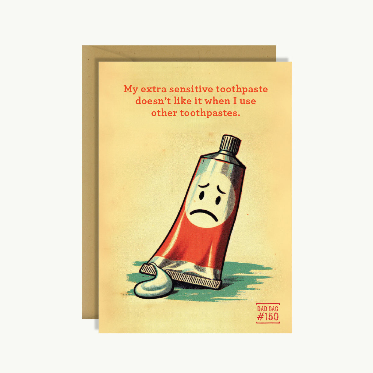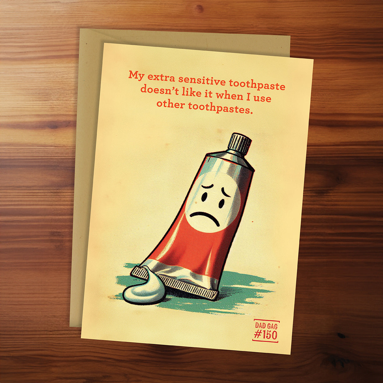 Card reads: Dad Gag #150. My extra sensitive toothpaste doesn't like it when I use other toothpaste.