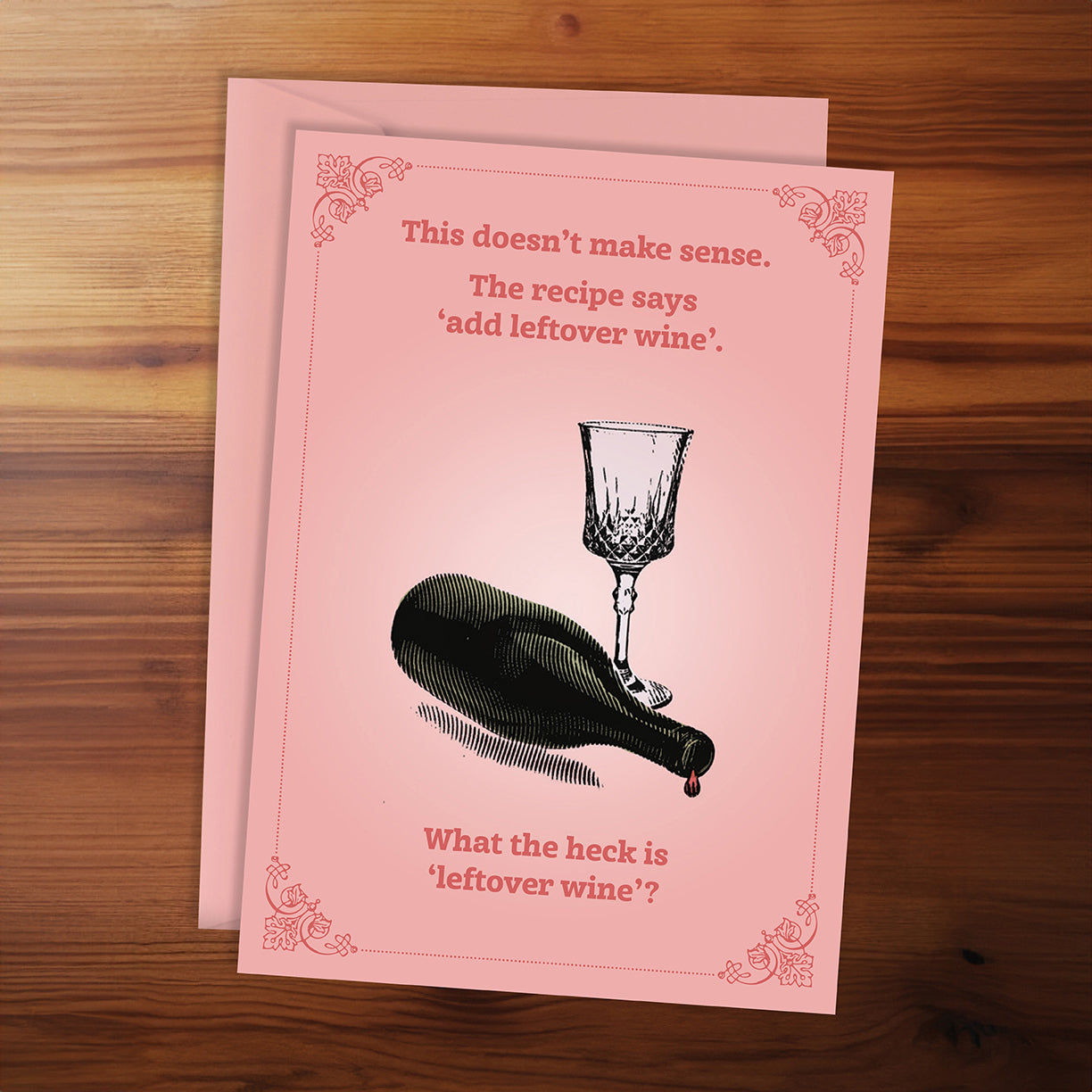 Card reads: This doesn't make sense. The recipe says 'add leftover wine'. What the heck is 'leftover wine'?