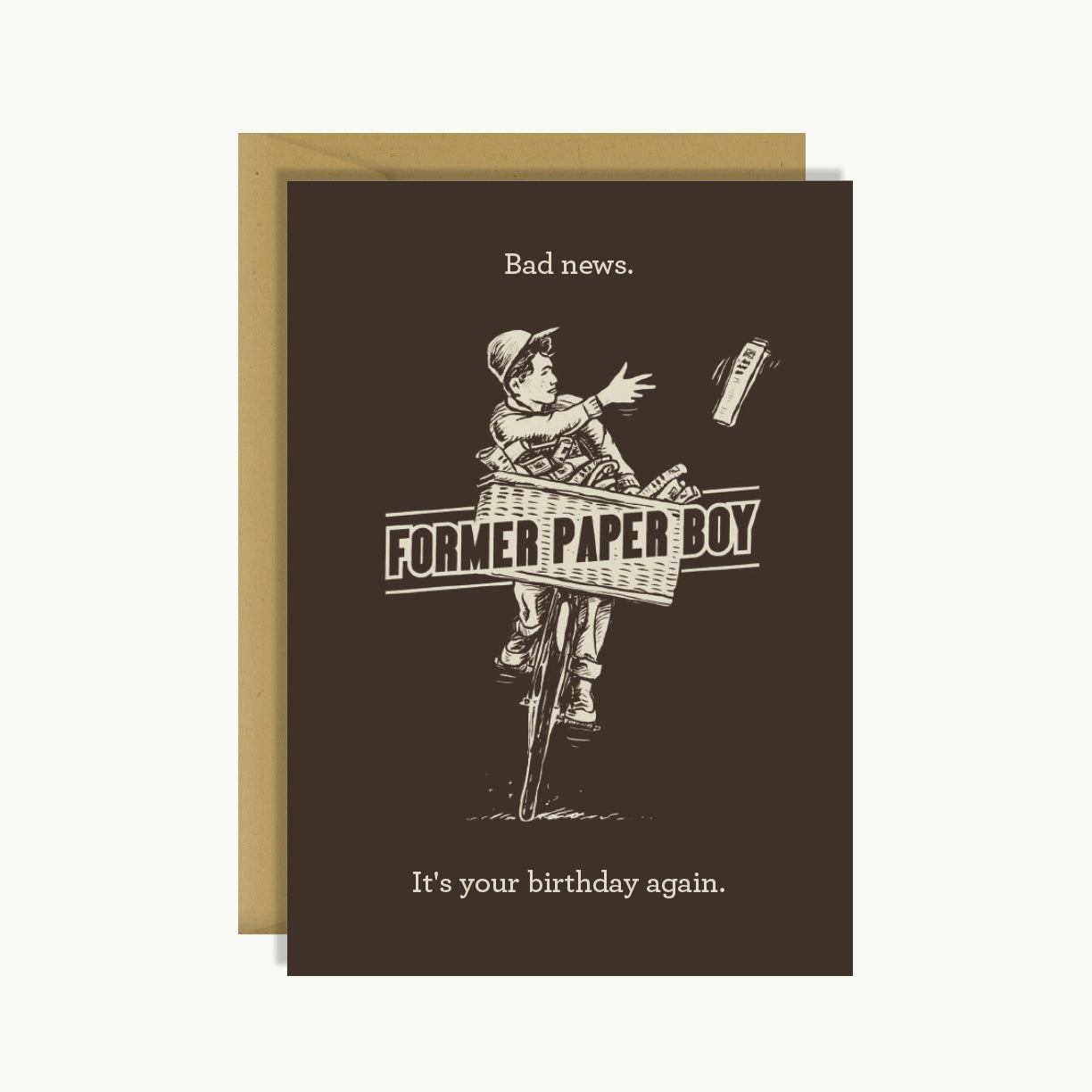 Card reads: Bad news. It's your birthday again. Former Paper Boy.