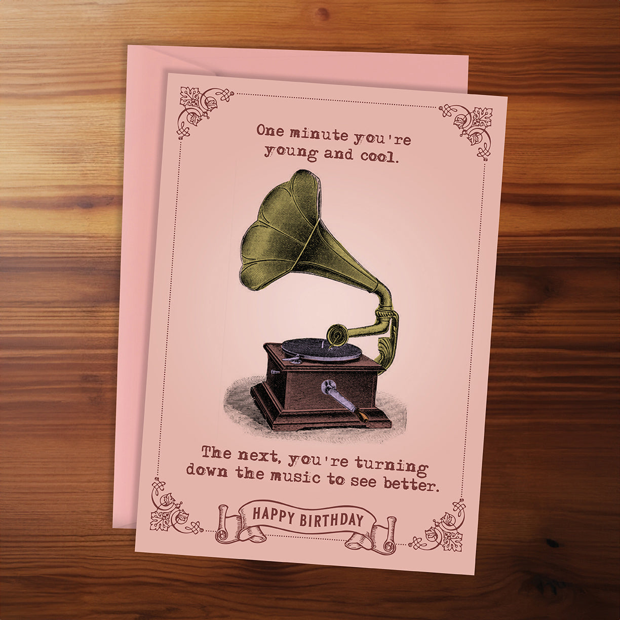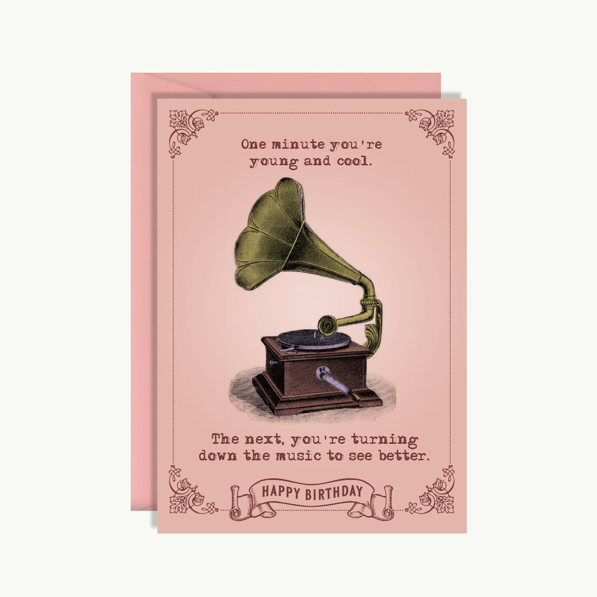 Card reads: One minute you're young and cool. The next you're turning down the music to see better. Happy Birthday.