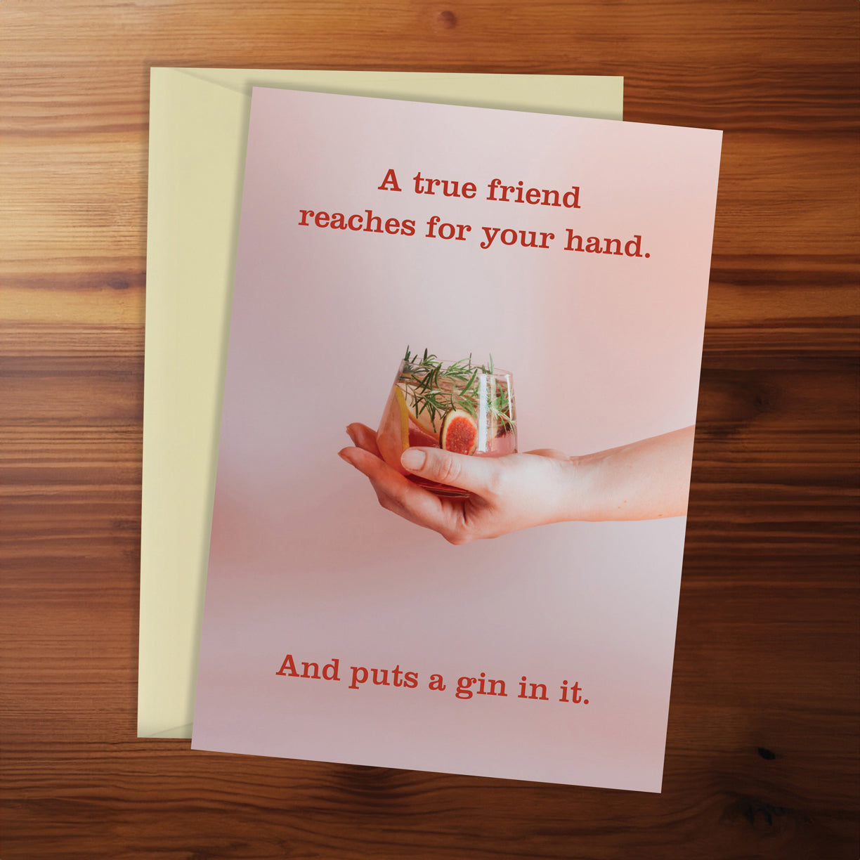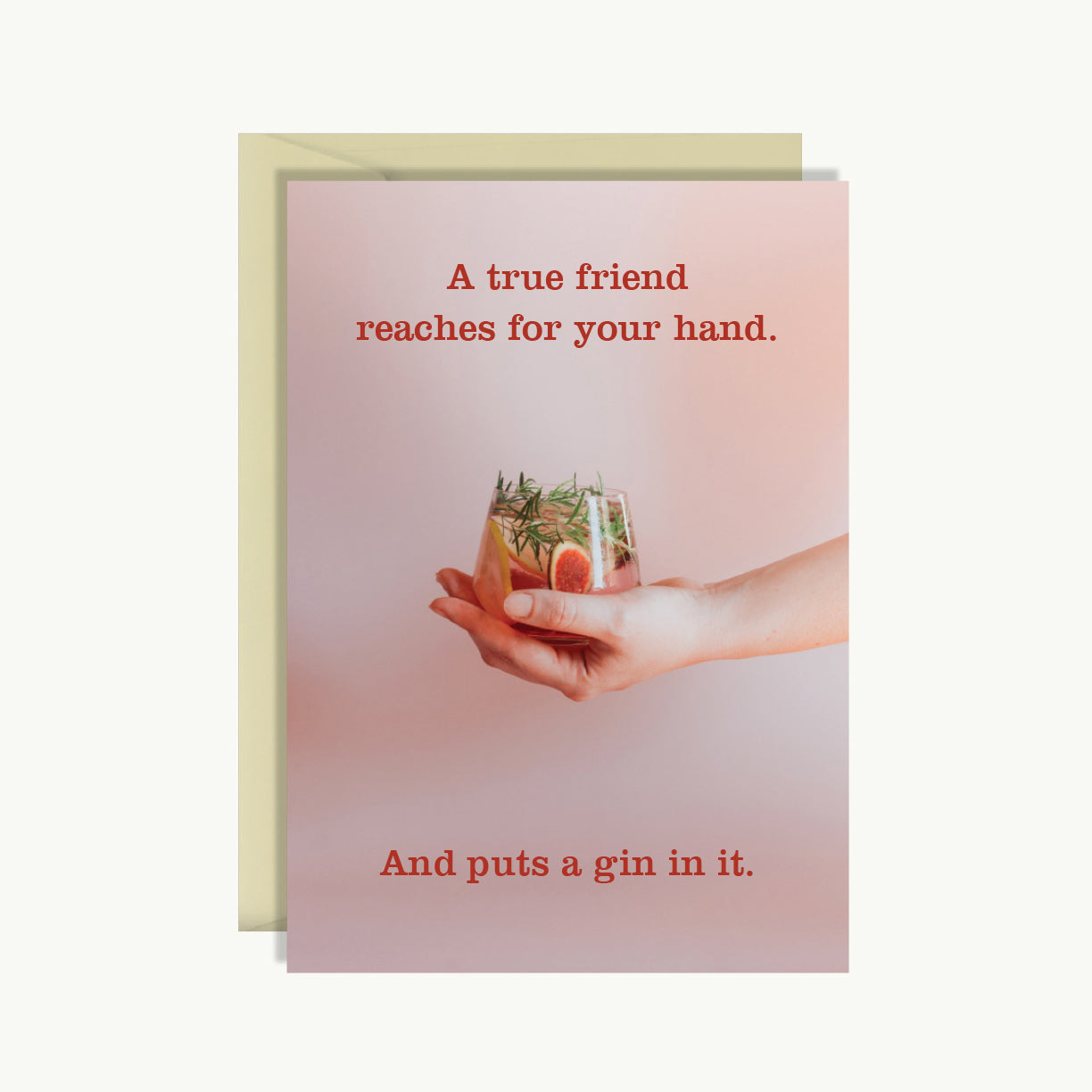 Card reads: A true friend reaches for your hand. And puts a gin in it.