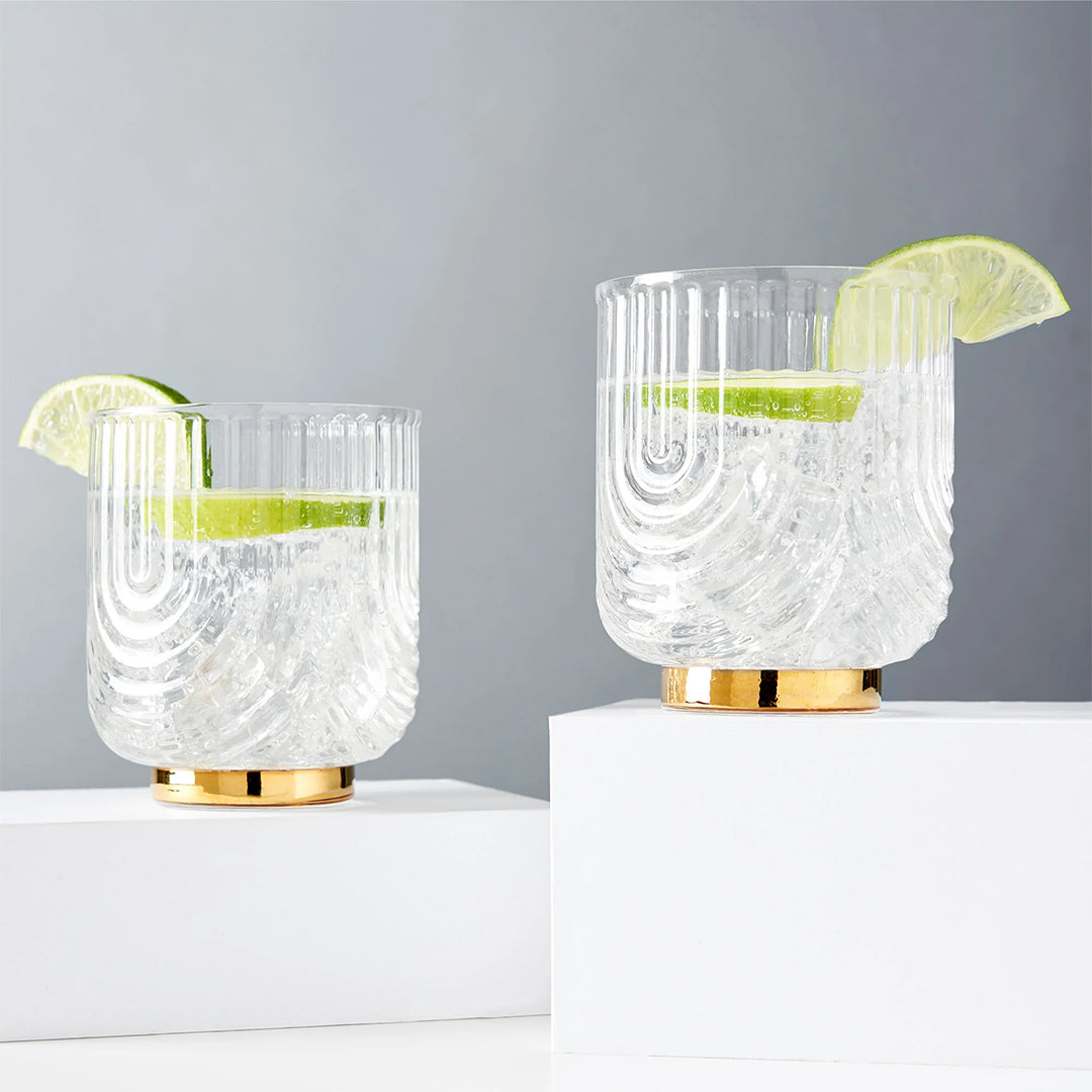 Polished gold and draping glass swathe the surface of this double old fashioned duo, adding a vestige of the Gilded Age to an already elevated set of glassware.