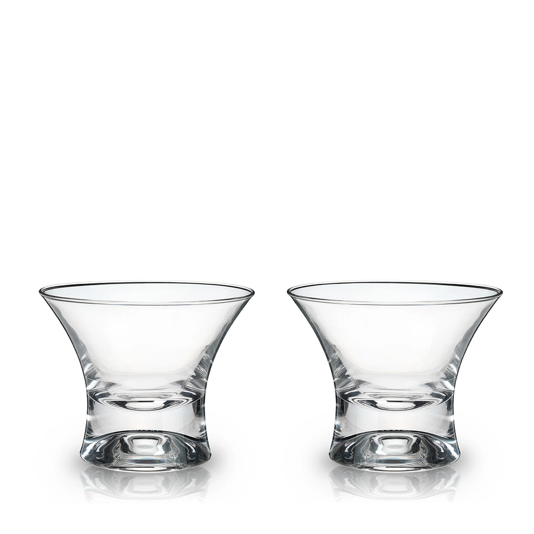 The stemless design, heavy base, and mid-century silhouette bring contemporary elegance to any cocktail.