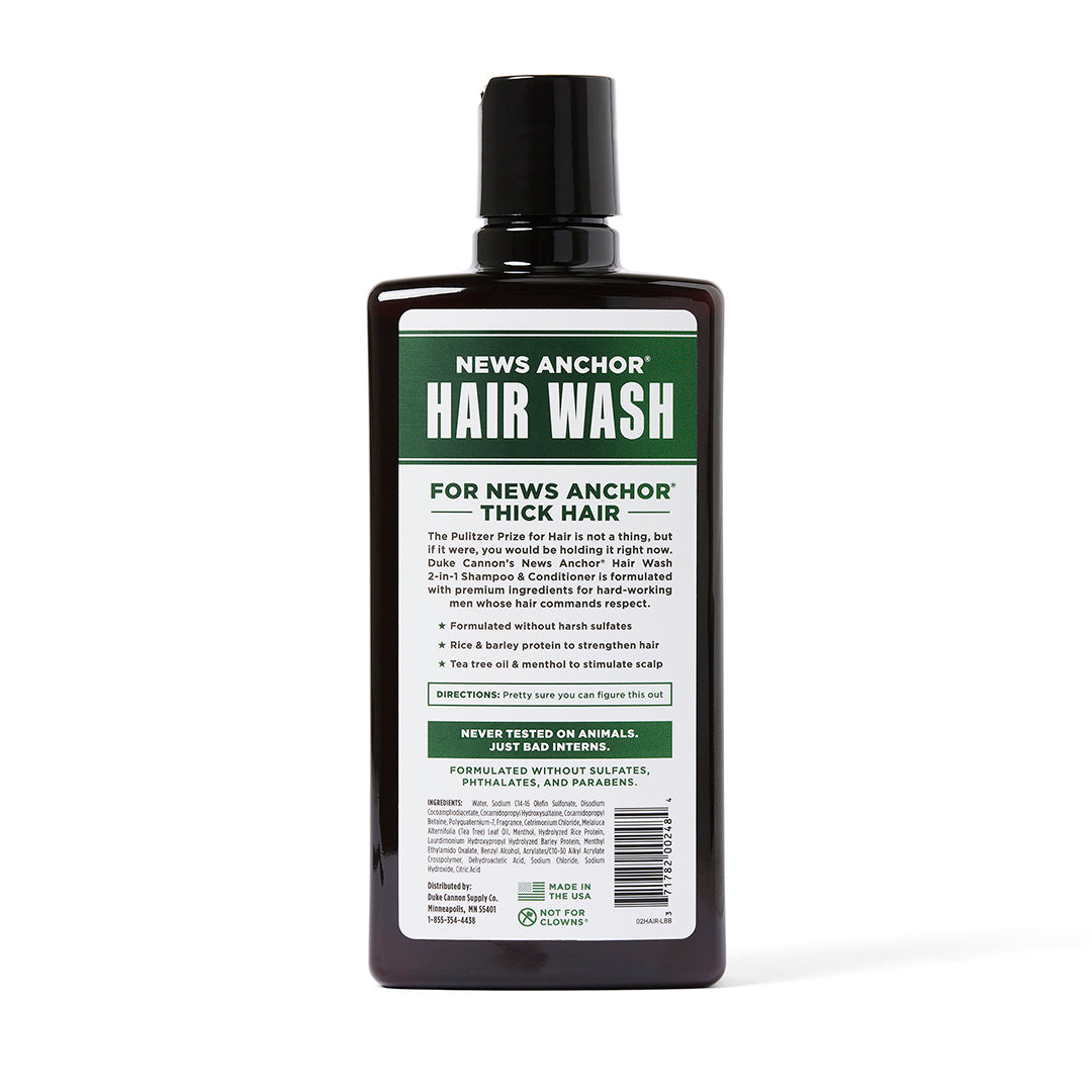 The Pulitzer Prize for Hair is not a thing, but if it were, you would be holding it right now. Duke Cannon’s News Anchor® Hair Wash 2-in-1 Shampoo & Conditioner is formulated with premium ingredients for hard-working men whose hair commands respect.