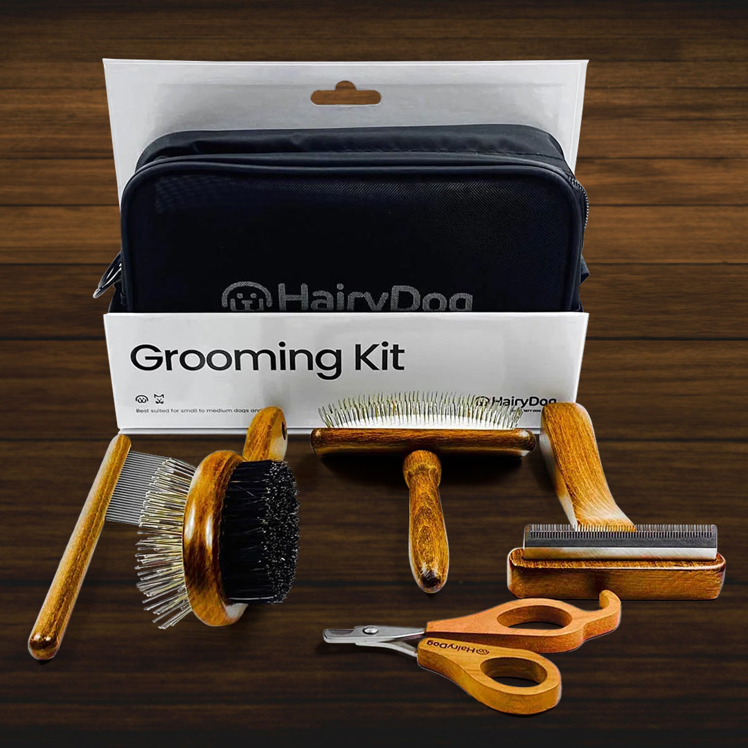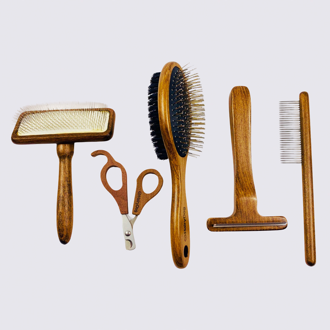 This complete travel grooming kit holds a curated collection of smart handmade wooden Beachwood and Walnut grooming tools, arranged within a sleek and breathable bag for on-the-go. Whether you're a novice or a seasoned pet owner, this kit equips you with all the essentials to keep your dog's or cat's appearance sleek, stylish and comfortable.