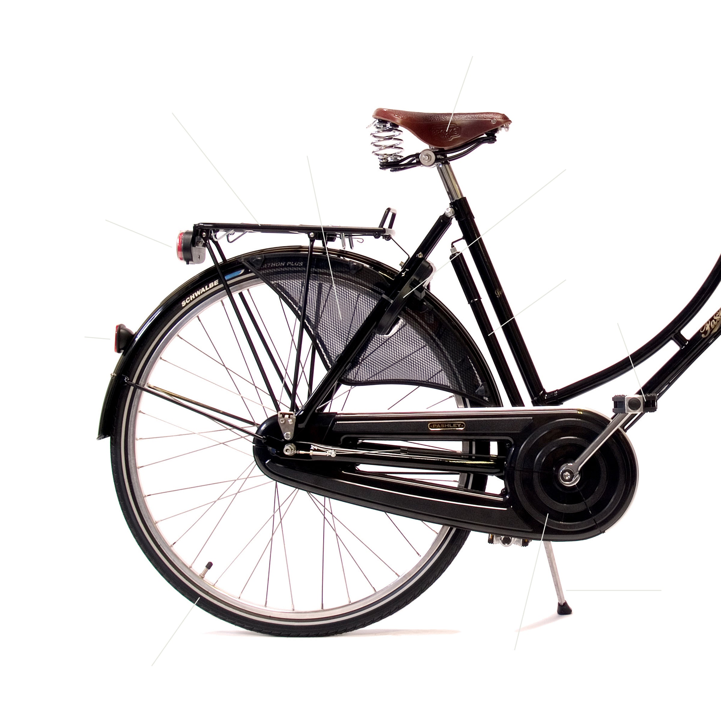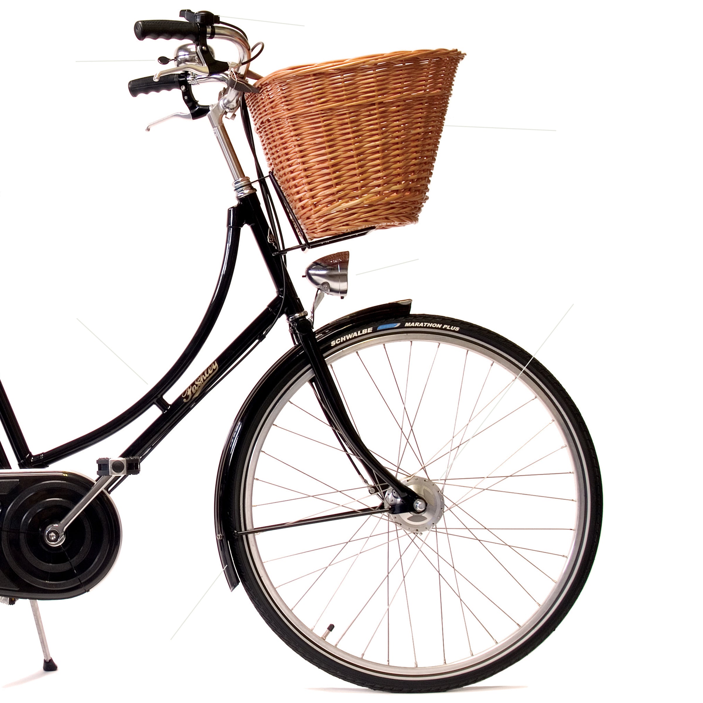 Fully-enclosed chaincase, large ding-dong bell, wicker basket, protective skirtguard, classic hub-dynamo headlamp, LED rear light, Pletscher alloy rear carrier, propstand, frame-fitting lock and pump.